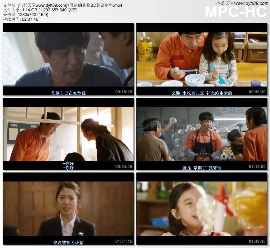 1997年,只有6岁儿童智商的智障男子李龙久(柳成龙 饰)和可爱的女儿艺胜(葛素媛 饰)相依为命,生活虽然简单清贫,却充满幸福。某天,执着为女儿买美少女战士书包的龙久意外卷入一起幼童诱拐奸杀案,而死者竟是警察局长的女儿。龙久懵懂无知,搞不清状况,昏头昏脑就被投入监狱。在7号牢房中,聚集着走私犯蘇杨浩(吴达洙 饰)、诈骗犯崔春浩(朴元尚 饰)、通奸犯姜万范(金正泰 饰)、恐吓犯老徐(金基灿 饰)和抢劫犯申奉植(郑万植 饰)等五毒俱全的“社会渣滓”。龙久孩子般纯洁的心渐渐感动了这几个“大坏蛋”,他们甚至不惜冒险将艺胜带入牢房与父亲相会。◎获奖情况 第34届韩国电影青龙奖(2013) 最佳男主角(提名) 柳承龙 最佳剧本(提名) 李焕庆 最佳配乐(提名) 最受欢迎电影奖 第49届百想艺术大赏(2013) 电影类 最佳影片(提名) 电影类 最佳男主角(提名) 柳承龙 电影类 最佳男配角(提名) 吴达洙 电影类 最佳女配角(提名) 朴信惠 电影类 最佳新人女演员(提名) 葛素媛 电影类 最佳编剧 金英石/李焕庆/金皇成 电影类 最佳人气男演员(提名) 柳承龙/吴达洙 电影类 最佳人气女演员 朴信惠 电影类 最佳人气女演员(提名) 葛素媛 第50届韩国电影大钟奖(2013) 最佳影片(提名) 最佳导演(提名) 李焕庆 最佳男主角 柳承龙 最佳女主角(提名) 葛素媛 最佳男配角(提名) 吴达洙 最佳新人女演员(提名) 葛素媛 最佳剧本 最佳企划 最佳摄影(提名) 最佳剪辑(提名) 最佳美术(提名) 最佳音乐(提名) 最佳服装(提名) 最佳照明(提名) 评委会特别奖 第4届豆瓣电影鑫像奖(2014) 鑫豆单元 最佳韩国电影(提名)◎电影讲堂 《7号房的礼物》是一部2013年上映的韩国温馨感人电影,韩国第8部超过1000万观影人次的本土电影,与历年来达到该项纪录的电影相比之下是预算最低、收益率最高的一部。由《方糖》和《冠军》的导演李焕庆掌镜,为柳承龙首部“One-Top”的电影,讲述有智能障碍的父亲蒙受不白之冤而入狱,他的女儿长大后在法庭上为其洗刷冤屈的故事。 柳承龙在拍摄《黄海》时已收到该片剧本,当时就被独特的故事和意外的角色深深吸引。 柳承龙在片场整天都抱着"女儿"葛素媛,几乎一刻也不分开,整个剧组都被浓浓的幸福感包围,直到影片杀青依旧万分不舍。 为了诠释智障父亲,剧组特意为柳承龙设计了一个天真无邪、充满喜感的西瓜头;塑造角色时,柳承龙也尽量站在一个稚童的思维模式上去揣摩,尽量收敛平时的阳刚江湖气。 郑进永在接受采访时透露,他和妻子一起看完剧本后都哭了,这样的电影就算不给片酬也会欣然出演。 本片制作费仅为35亿韩元,加上宣传行销也不过约58亿韩元,发行商NEW为韩国电影界规模排名第四,没有自己的院线,在排片上也无优势,但上映23天就吸引773万名观众,票房高达556亿韩元。上映第25天,一举超越2008年《非常主播》所创下的喜剧片票房最佳纪录。上映第32天,成为韩国影史上第8部观影人数达1,000万的本土电影,上映第46天,观影人数突破1,200万。最终观影人次为12,811,206人次。◎影片评价 《我是山姆》的《美丽人生》。 影片架构与西恩·潘和达科塔·芬宁主演的好莱坞电影《我是山姆》有点类似,导演李焕庆和柳承龙、朴信惠、吴达洙、朴元尚等演员携手打造了一个搞笑、温情又令人感动的故事。影片也直面智障父亲是否能够抚养女儿这个现实性的问题,展现了他们所遇到的种种障碍,催人泪下。主演柳承龙在电影中既要演绎出患有智障,而只有6岁智商的父亲的单纯,又要表现出对女儿父爱情深的一面,其演技让人赞叹。同样清纯惹人怜的女主角朴信惠和可爱至极的小女孩,都是威力强大的催泪弹。