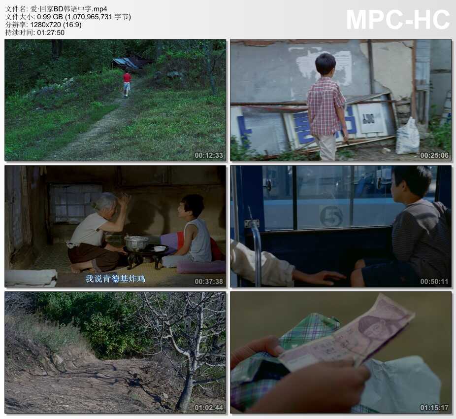 为了方便找工作,妈领着7岁的相宇(俞承浩饰)去乡下的外婆家,想把他暂时留在那里。外婆(金亦芬饰)年事已高,不能说话也不识字。而一直生活在城市里的孙子相宇,刚开始无法适应连游戏机、电池都没得卖的乡下生活。他开始蛮横地流露出不满,抱怨这个抱怨那。为了买电池,偷走外婆的银头簪拿去卖;外婆得知孙子想吃炸鸡,却只理解到鸡肉,炖了只鸡给孙子吃,却被生气的相宇踢翻了。老人家默默包容着孙子的一切,渐渐的,相宇也体会到外婆的良苦用心,适应并喜欢上了乡下生活。◎获奖情况第22届香港电影金像奖(2003)最佳亚洲电影(提名)◎电影制作电影《爱·回家》是李延香导演根据对自己外婆的回忆拍摄的,是一个外孙女送给外婆的礼物。演员几乎都是业余演员:扮演外婆的演员金亦芬,1926年出生在庆尚北道,靠院子里的100多棵胡桃抚育了1男2女。她在山沟里生活了一辈子没有任何演出经验;扮演小外孙相宇的演员俞承豪只出演过韩国电视剧《刺鱼》,表演经验也不丰富。而影片中其余演员均为当地村民。◎影片评价《爱·回家》这部电影娓娓讲述平凡、朴素、单纯的生活,没有虚构的痕迹,同时也不陷入幼稚的煽情,它奉献的是爽朗的笑声和温馨的感动,这就是电影所追求的效果。李延香导演意在拍摄能充分体现生命意义的电影。