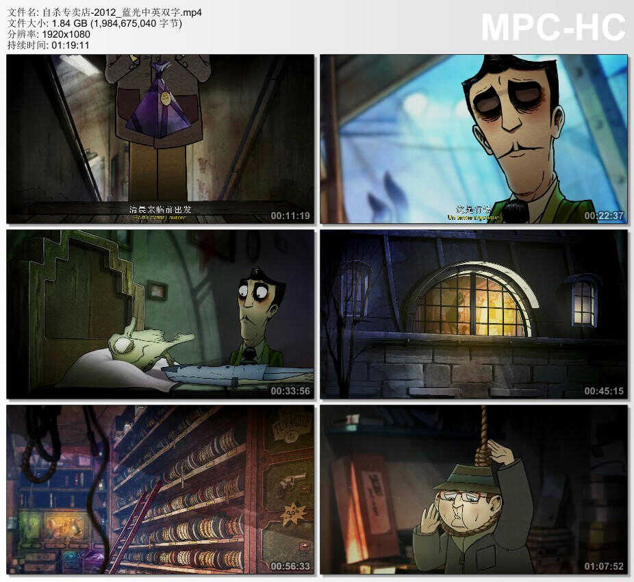 死气沉沉的法国小城,一家有口皆碑的老店却格外生意兴隆。原来这家祖传老店代代皆以贩卖自杀产品著称。在如此灰暗恐怖的小镇上,自杀成了当地居民稀松平常之事,这也是小店异常火爆的原因。经营此店的老板三岛了无生气,老板娘更是日日愁眉苦脸。他们早就丧失了对生活的热情,终日郁郁不安。长期贩卖自杀用品,让他们濒临崩溃的边缘。幸好他们的一双儿女还热爱着生活,尤其是他们的小儿子阿伦,笑容总是挂在他的脸上。然而,阿伦热爱生活的态度却威胁着老店的经营,父亲想尽办法让阿伦变得消沉,甚至把阿伦逼上了绝路…… 本部极富想象力的法国动画电影,改编自法国漫画家让·特磊的畅销小说。曾执导《理发师的情人》等影片的法国导演帕特利斯·勒孔特,此次首度尝试制作动画影片。影片不仅处处体现着法式特有的黑色幽默,还加入了大量歌舞元素,借这些载歌载舞的动画人物之口,道出生与死间的深刻哲理。